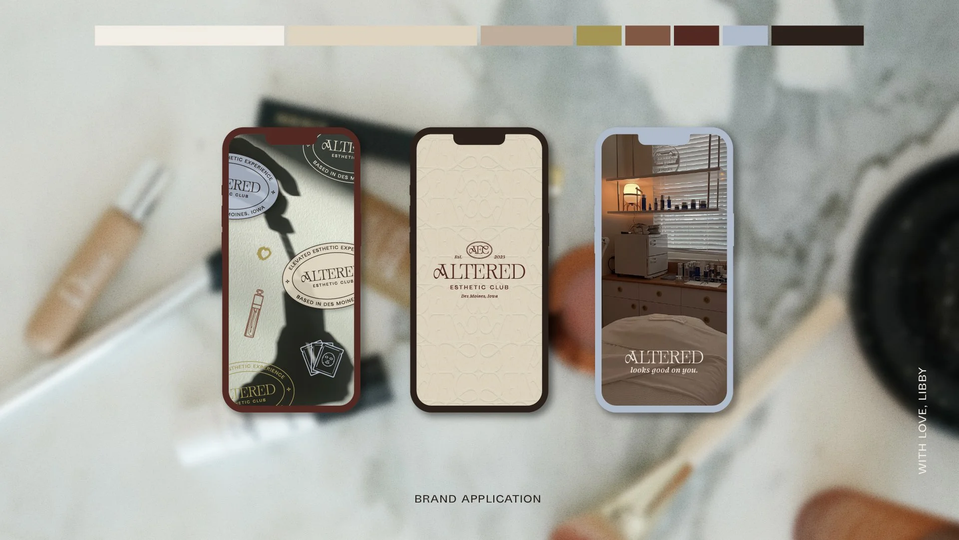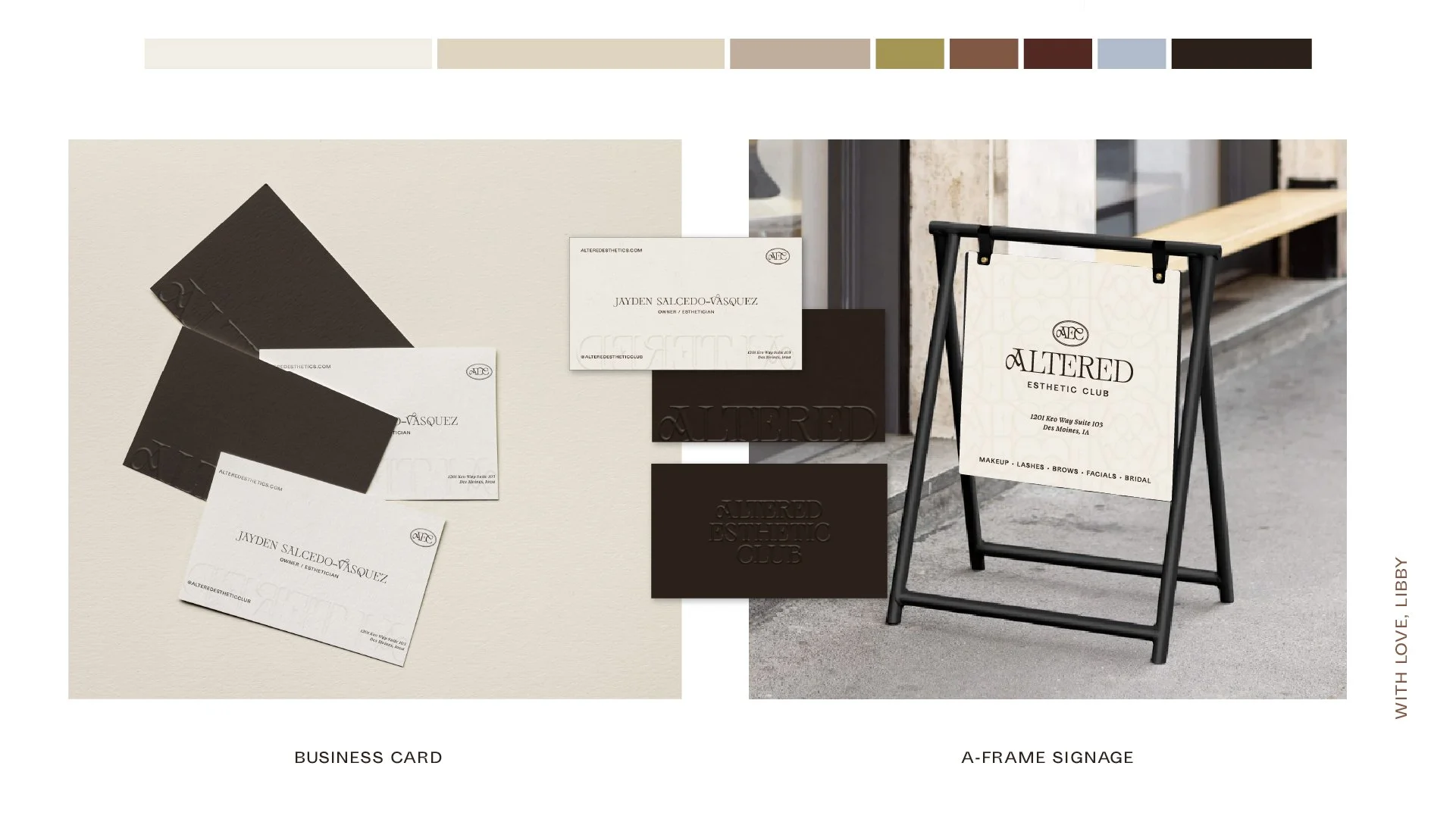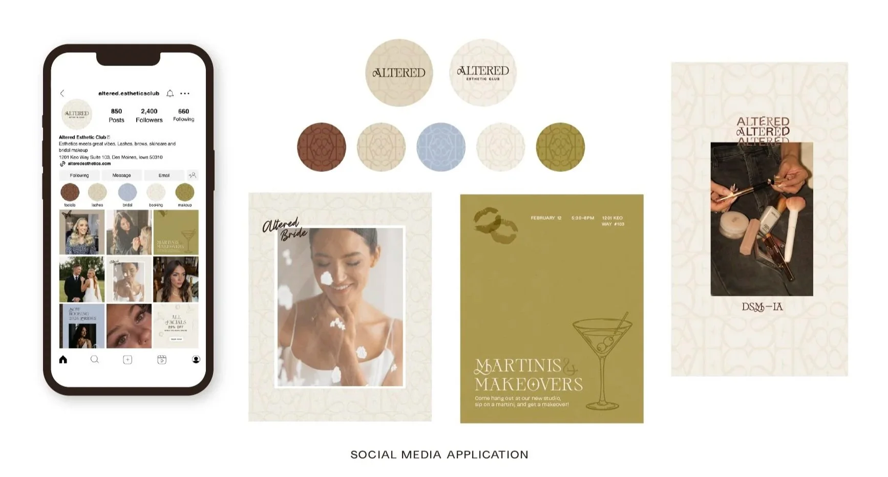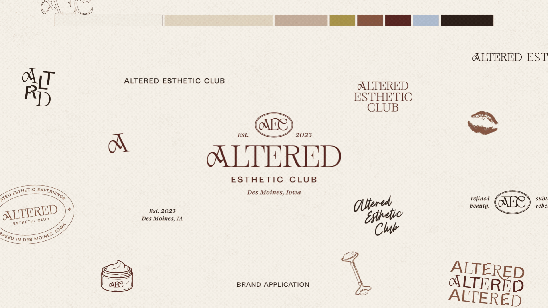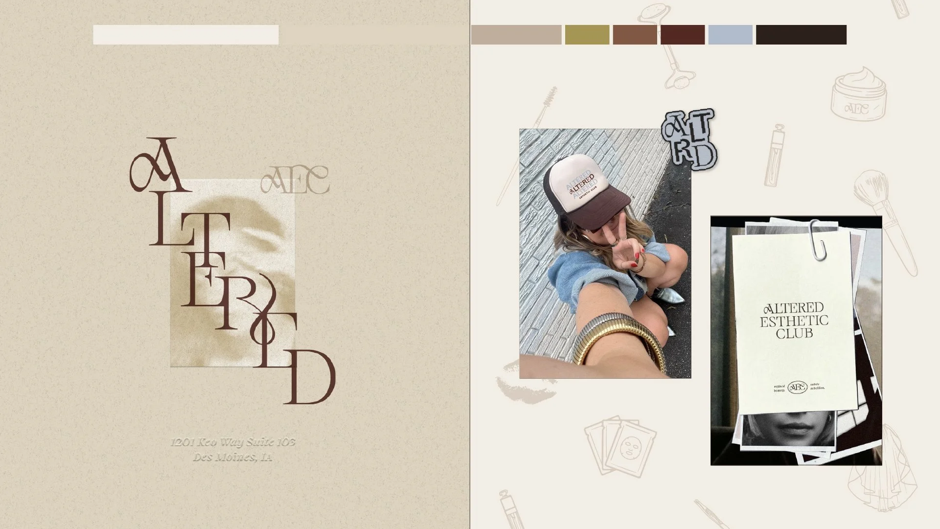 The typography and colors are timeless and luxurious, with a recognizable AEC monogram mark and pattern to further push Altered as a standout esthetician business in Central Iowa.